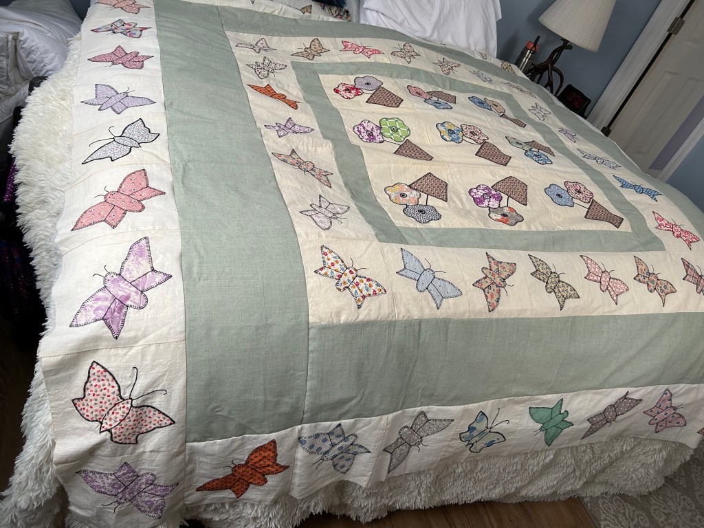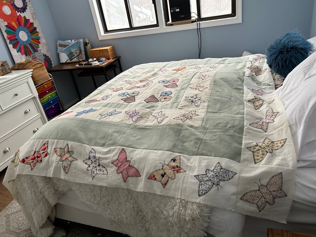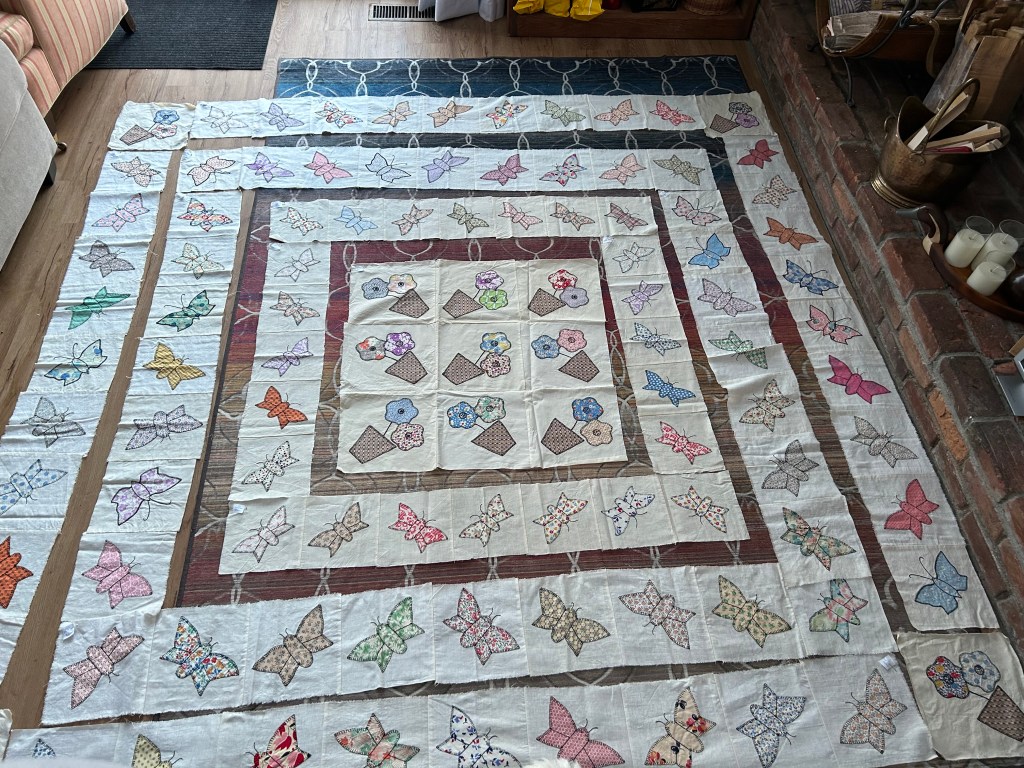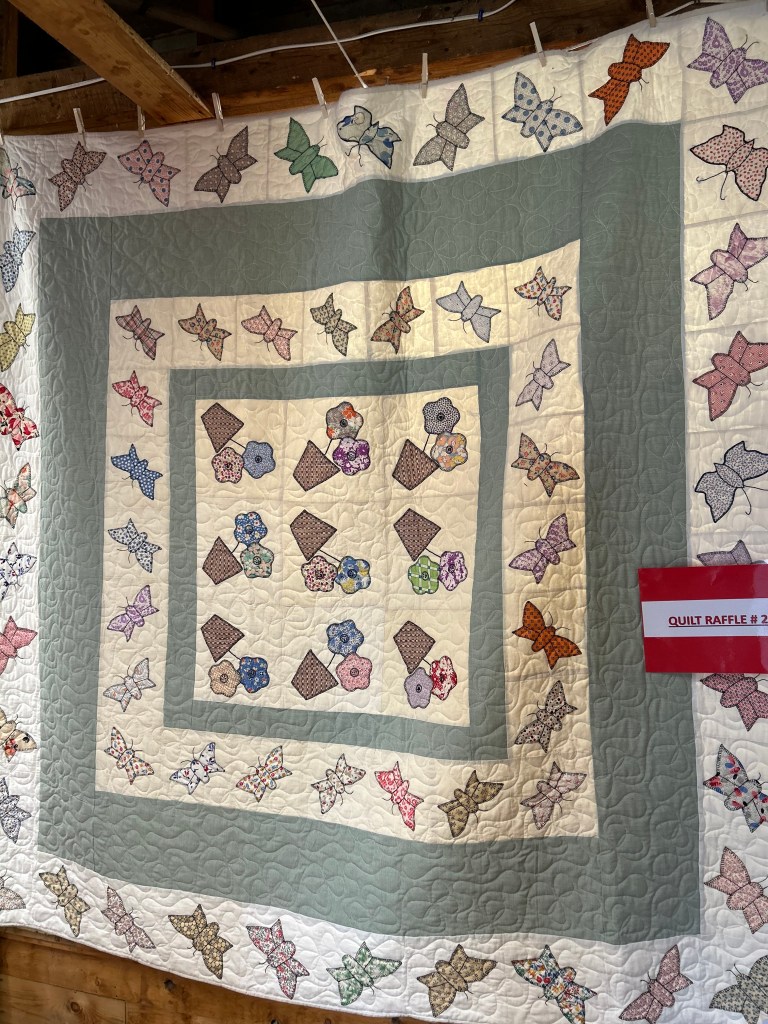 This was the other raffle quilt for the Bondville Fair. It is made from antique, hand-appliquéd butterfly blocks from the 1930-40’s made by two local Bondville ladies and donated to us. Below are images of it hanging in the Quilt Hall, laid out at my house, and at the Stitch-n-B*tch Group where the members helped me figure out the initial design of the blocks.