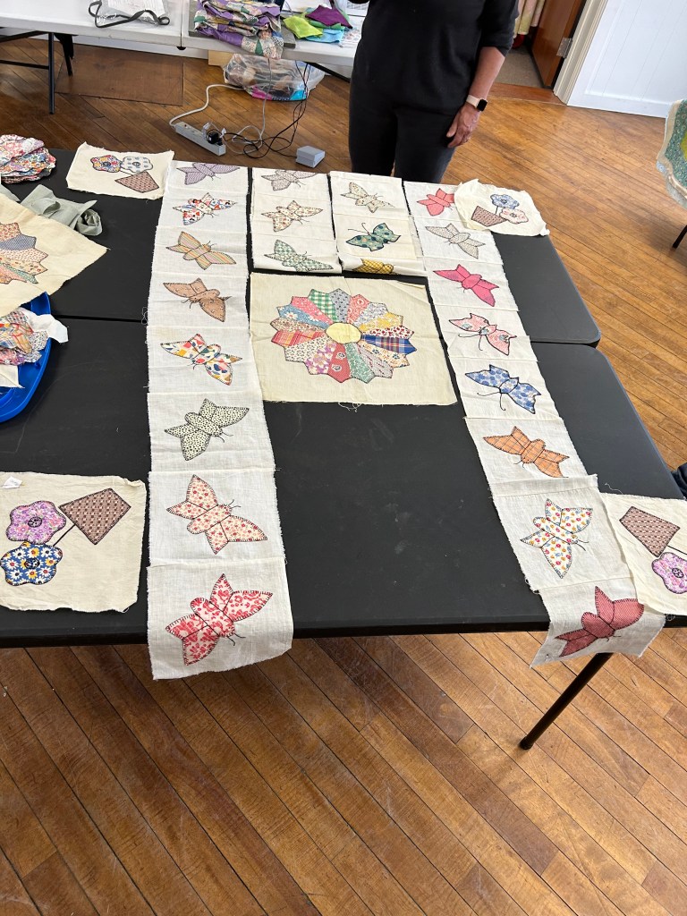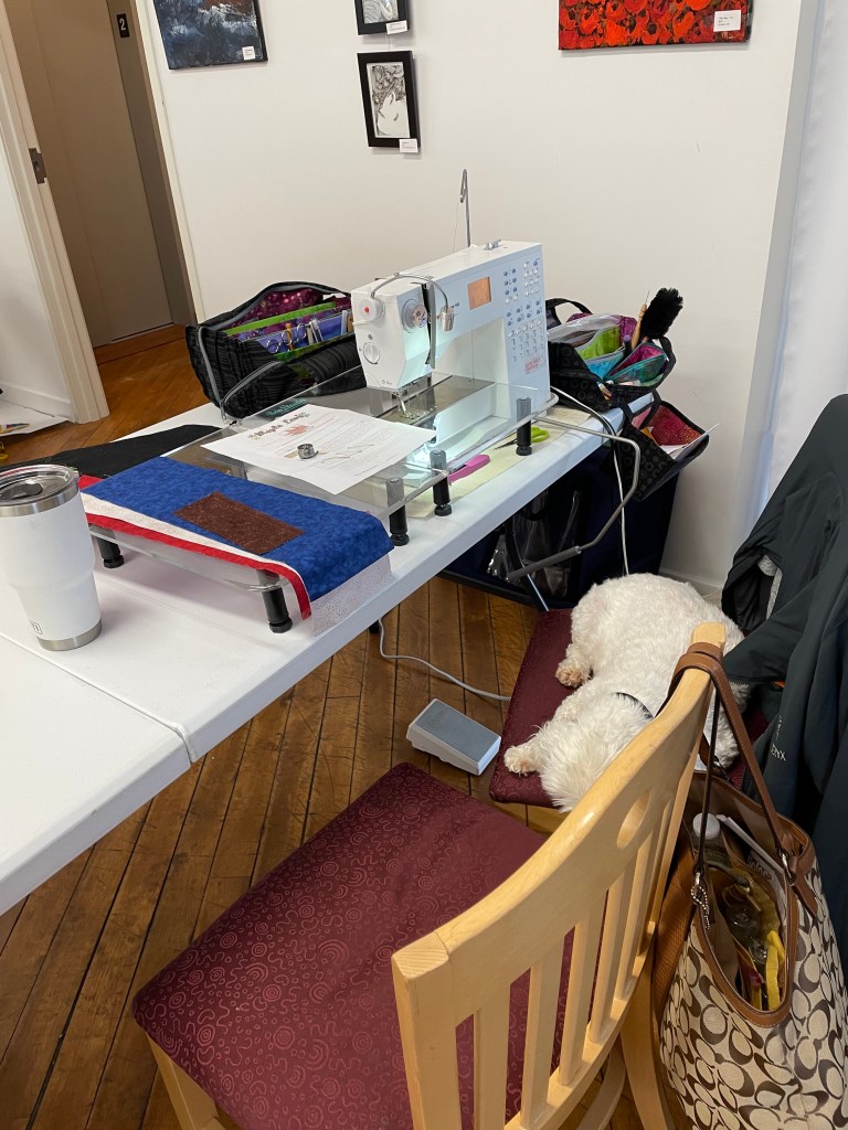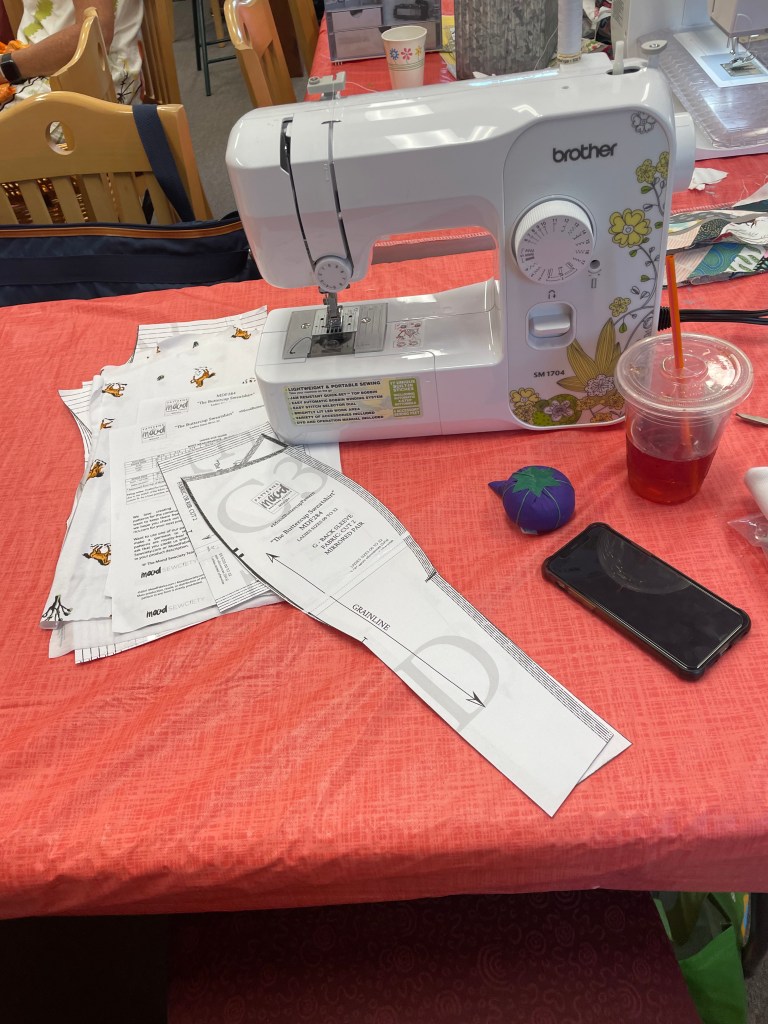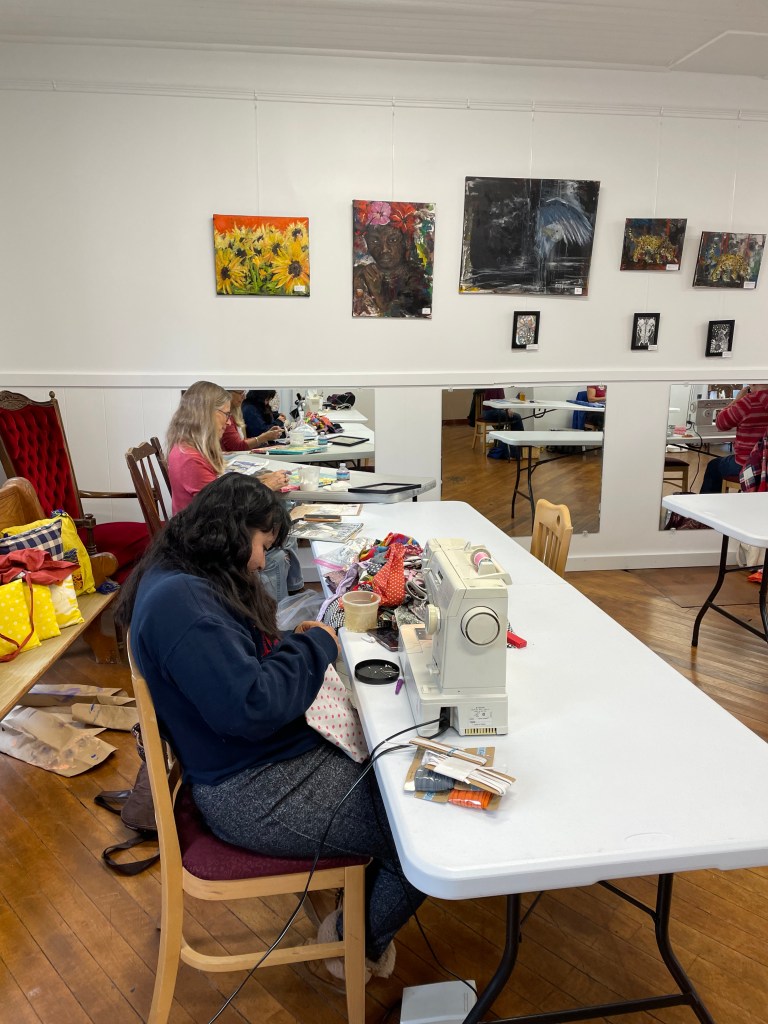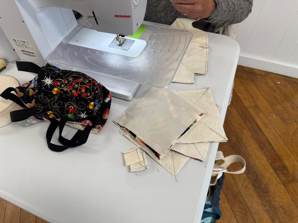 We take up the top floor of the building. There is great light, and open space, plenty of electrical wall plugs and extension, plus great tables and chairs. We generally pull out tables as people arrive, and then they can set up their sewing stations as they like. We have a small ironing station set up. We are all working and chatting, and laughing. Everyone brings a snack to share, so we have a table set up for that too.