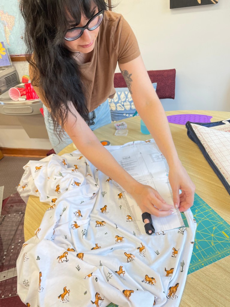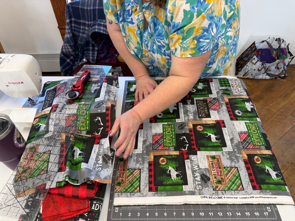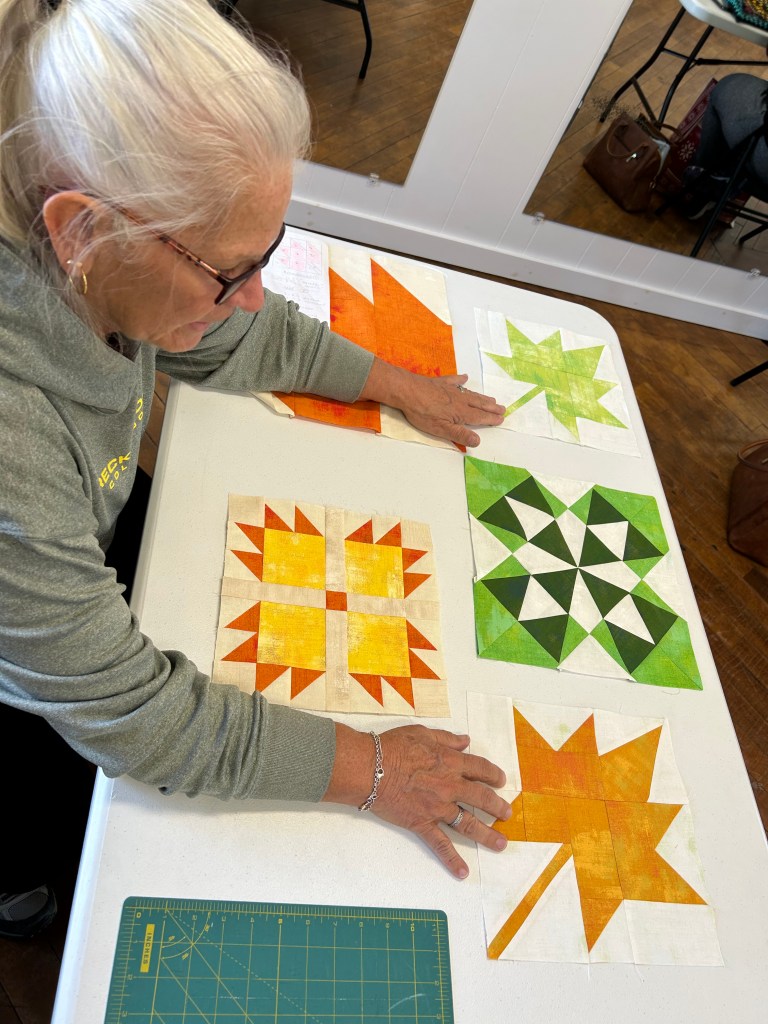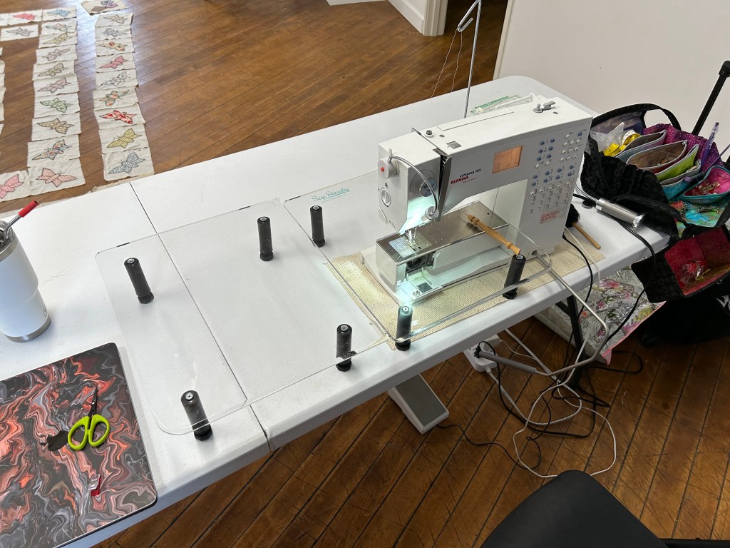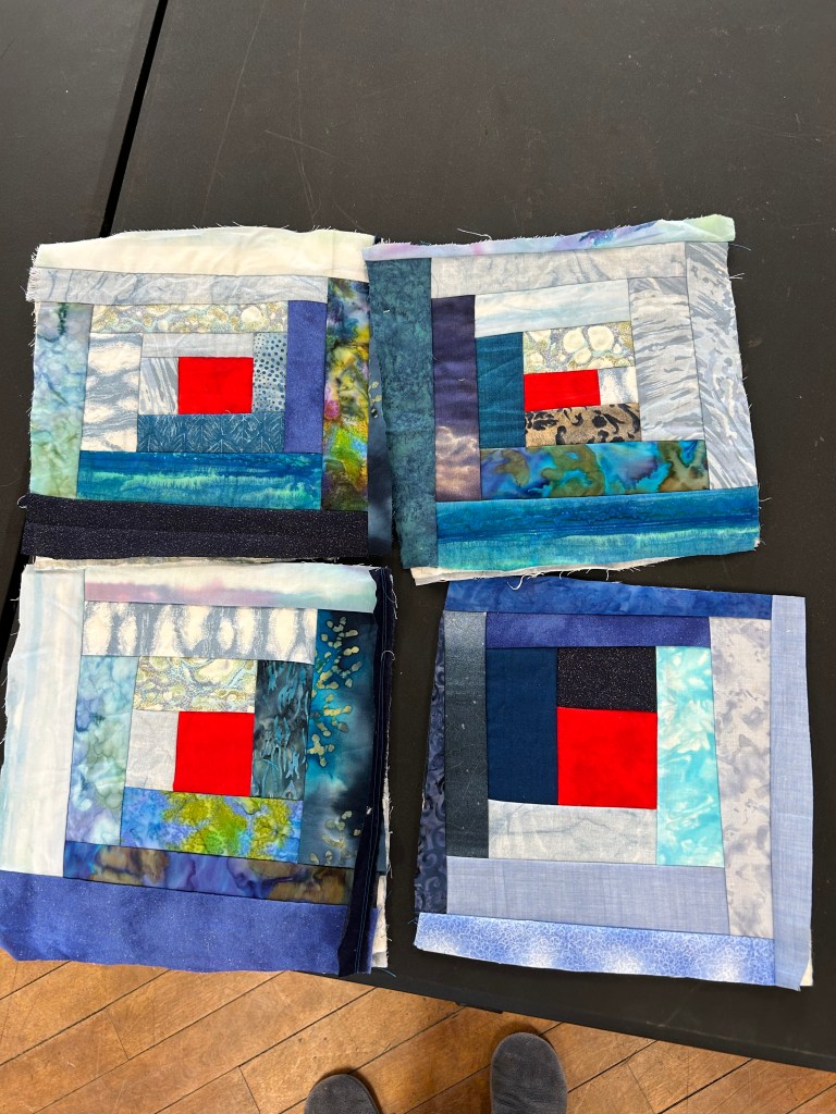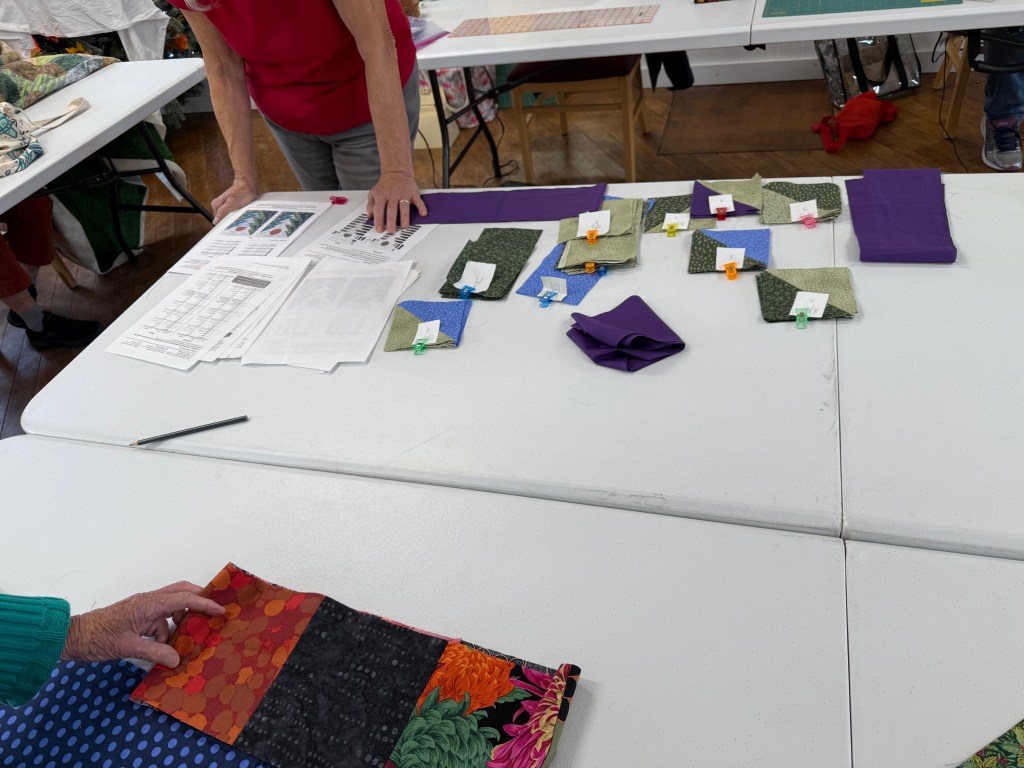 We take up the top floor of the building. There is great light, and open space, plenty of electrical wall plugs and extension, plus great tables and chairs. We generally pull out tables as people arrive, and then they can set up their sewing stations as they like. We have a small ironing station set up. We are all working and chatting, and laughing. Everyone brings a snack to share, so we have a table set up for that too.
