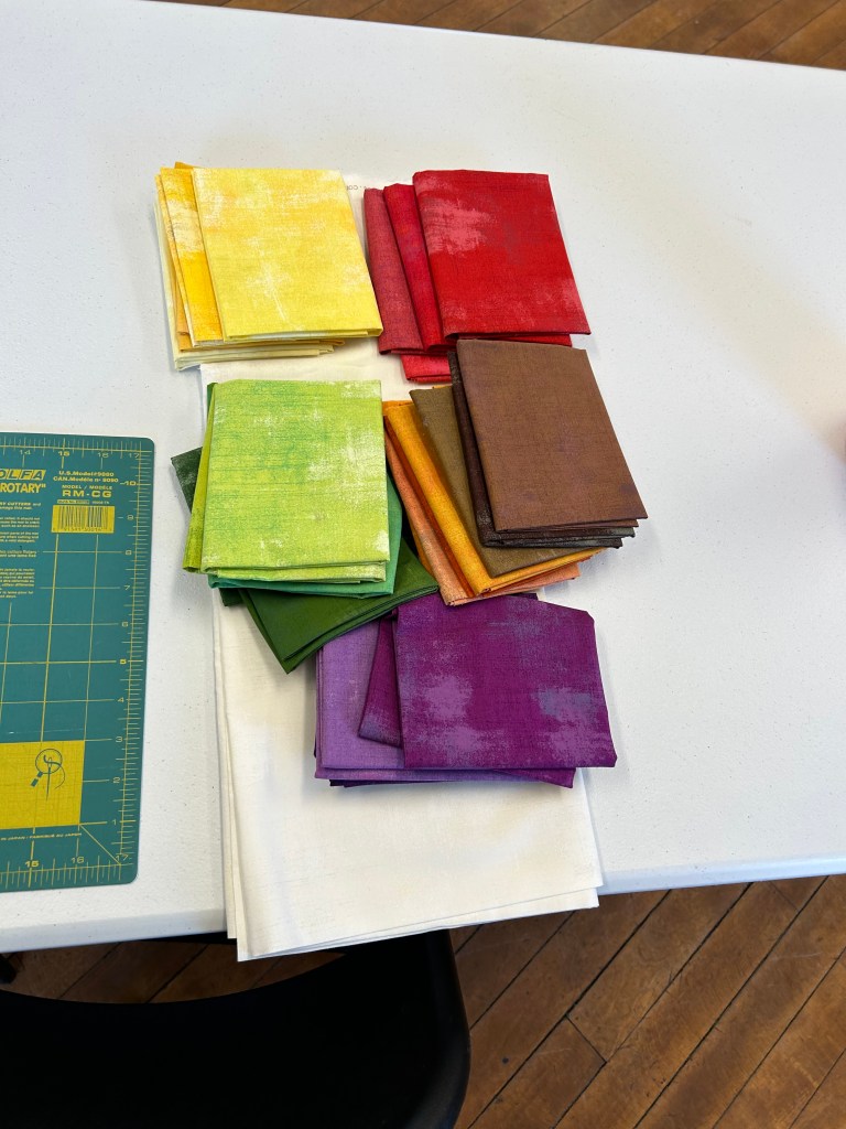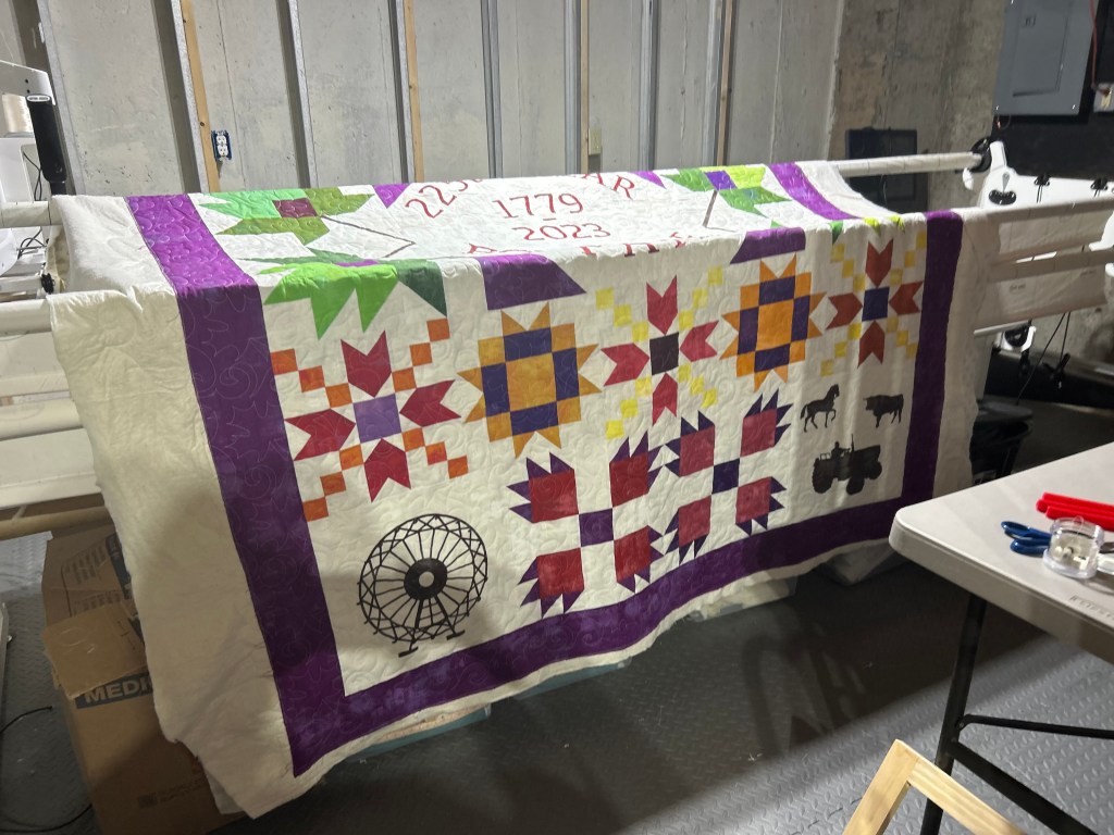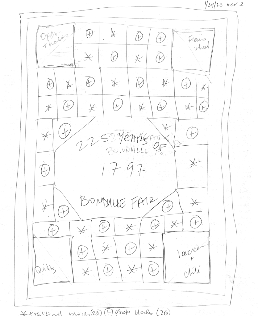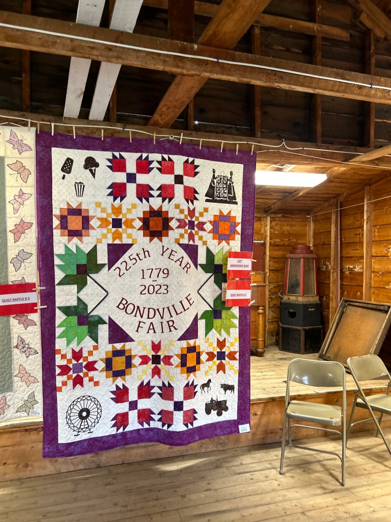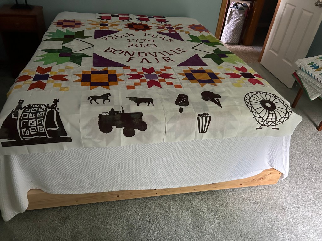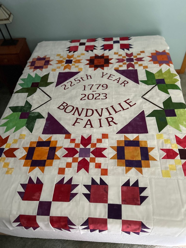 In March, Penny and I had started working on a 225th Year of the Bondville Fair commemorative quilt to be raffled for the fair. The drafted version we chose is below. Here is Penny showing the blocks she has made for the quilt: Maple Leaf, Bear Claw and Vermont Star and the grunge fabrics we are using. Thanks Penny for your amazing quilting talent and design eye!!