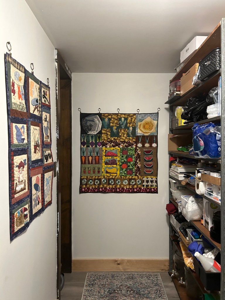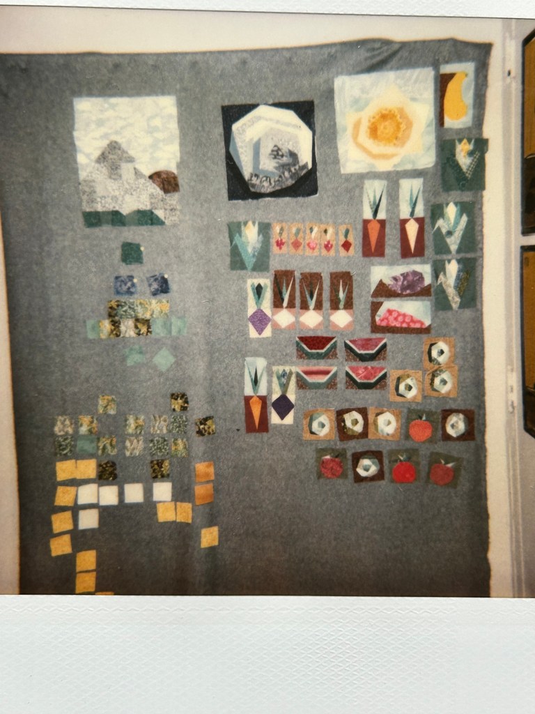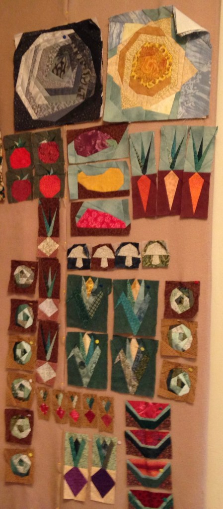 This quilt was begin in 1999. I fell in love with the foundation paper piecing (by hand) technique and found the veggies and fruit thrilling. Now that I’m in my new home I unpacked the pieces and have decided to finish all my UFOs (UnFinished Objects) so the I can begin 2024 with a really clean slate. I have started trying to make the pieces come together and I’m really enjoying the process.