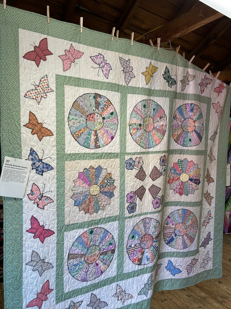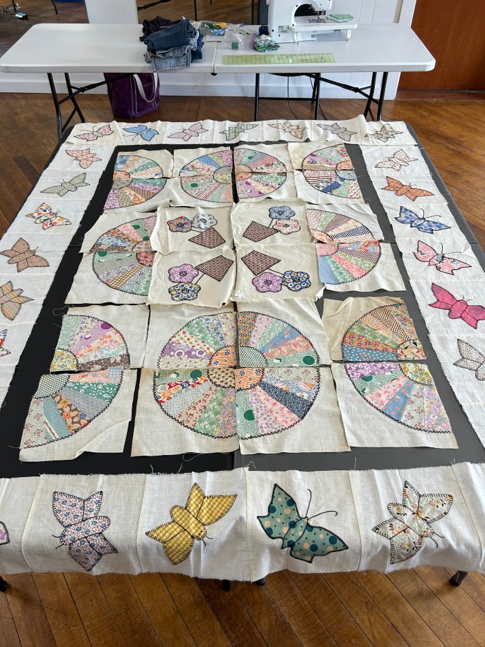 Original-design raffle quilt for this year’s Bondville Fair, using leftover, donated butterfly and flower blocks from the Carolyn Harris family. Finally completed August 1st 2024 and quilted and bound by Penny Allen (Madame Sewloft). It was shown at the Bondville Fair Quilt Show 2024. This quilt was lovingly made for one of our sewing group’s staunch supporters, Laura. We love you Laura!