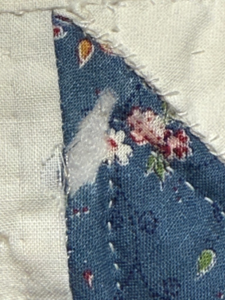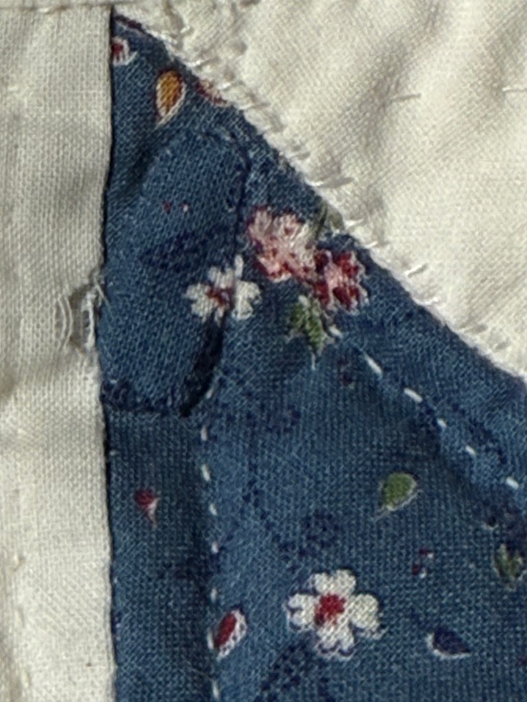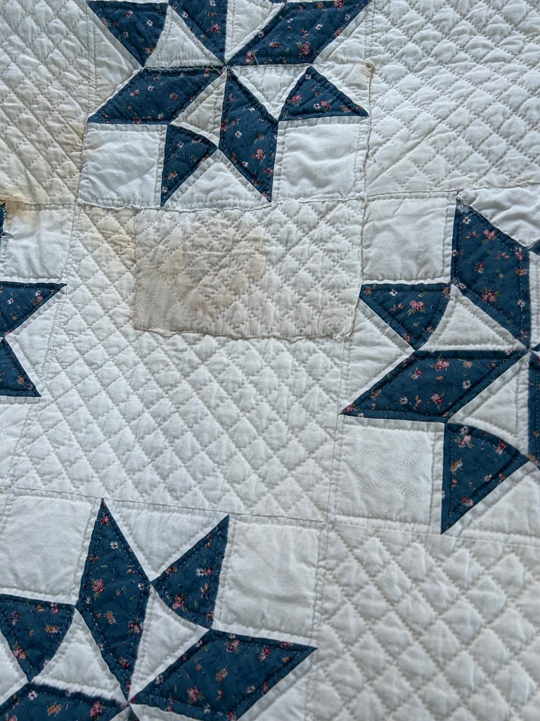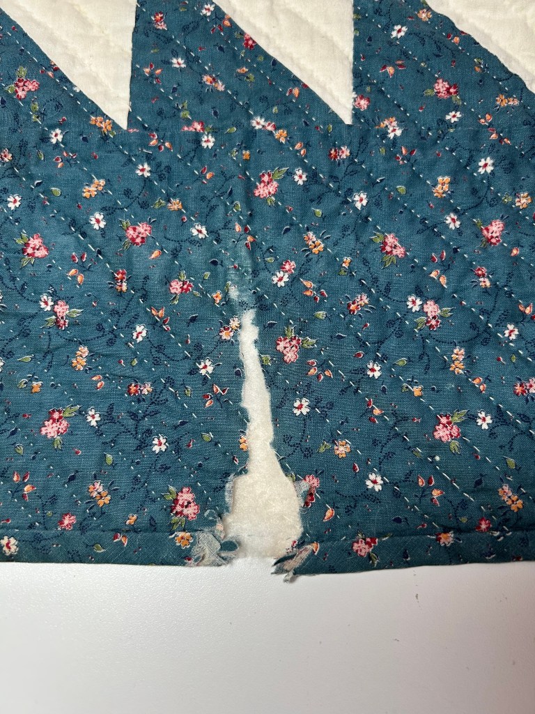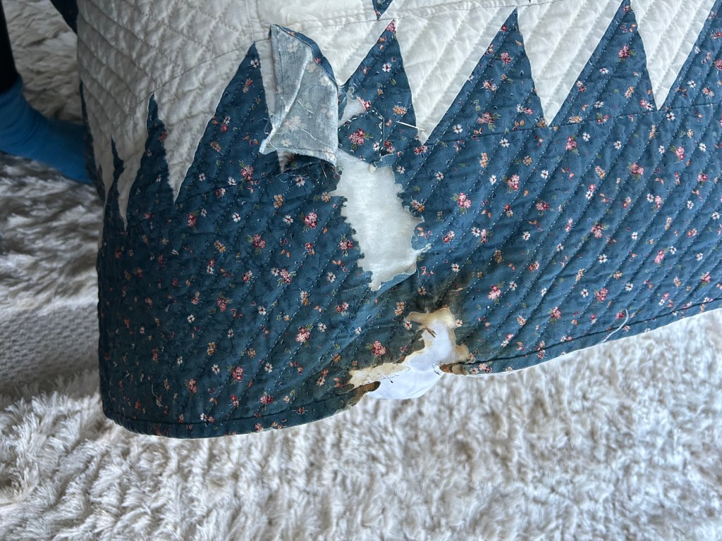 This quilt is an eight-pointed star, possibly the Sarah’s Choice quilt block, in blue calico and cream muslin, and measures 84″ x 97″. The restoration areas – needed on the back and front of the quilt – basically include several of these types of issues (see images at bottom): burn marks, holes, missing batting, mysterious exposed seams, bad patching, and missing quilting.