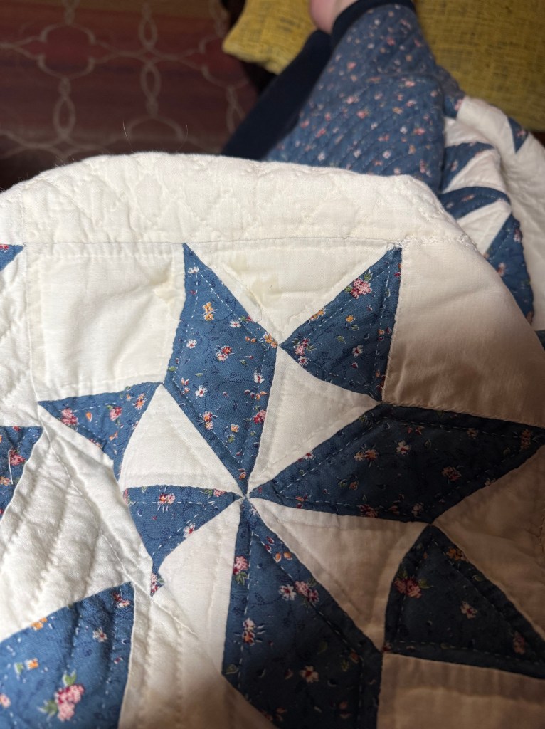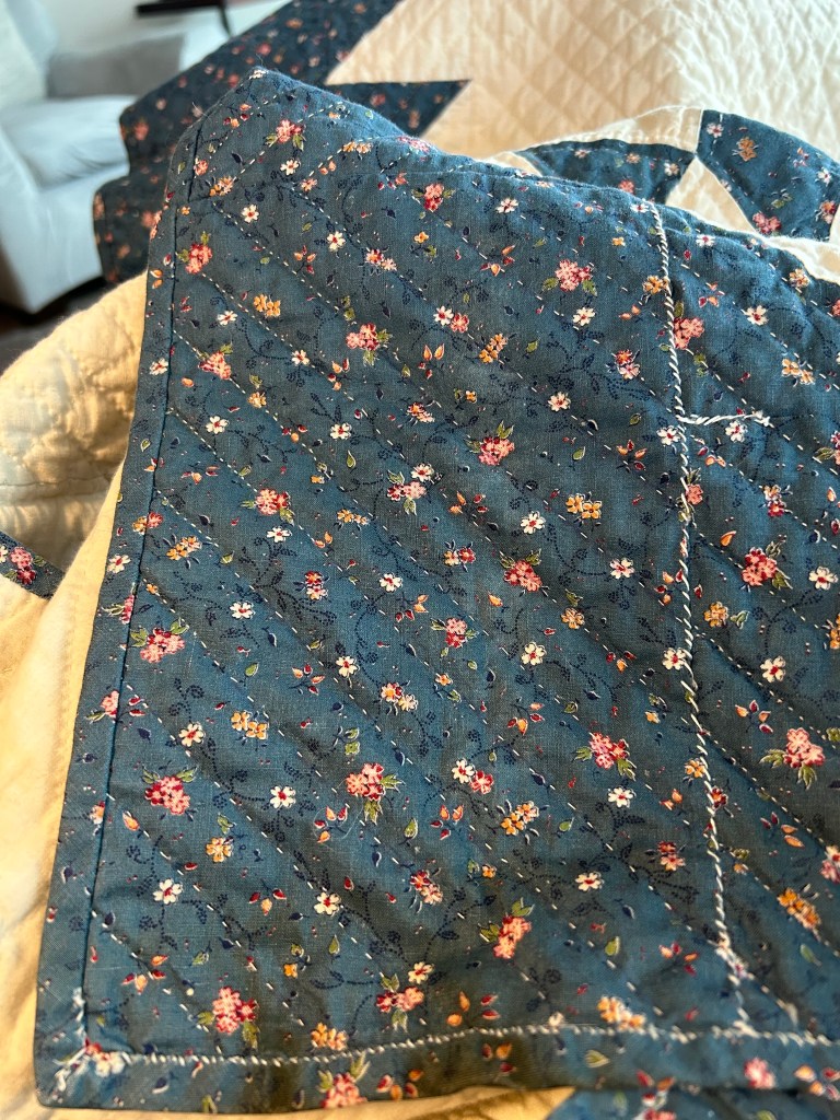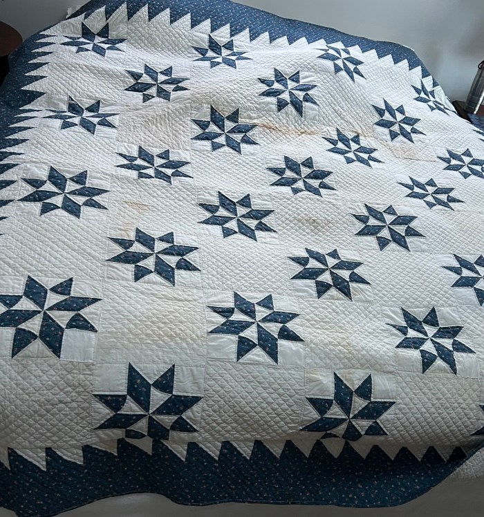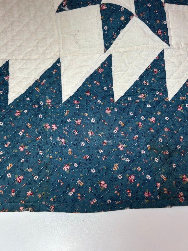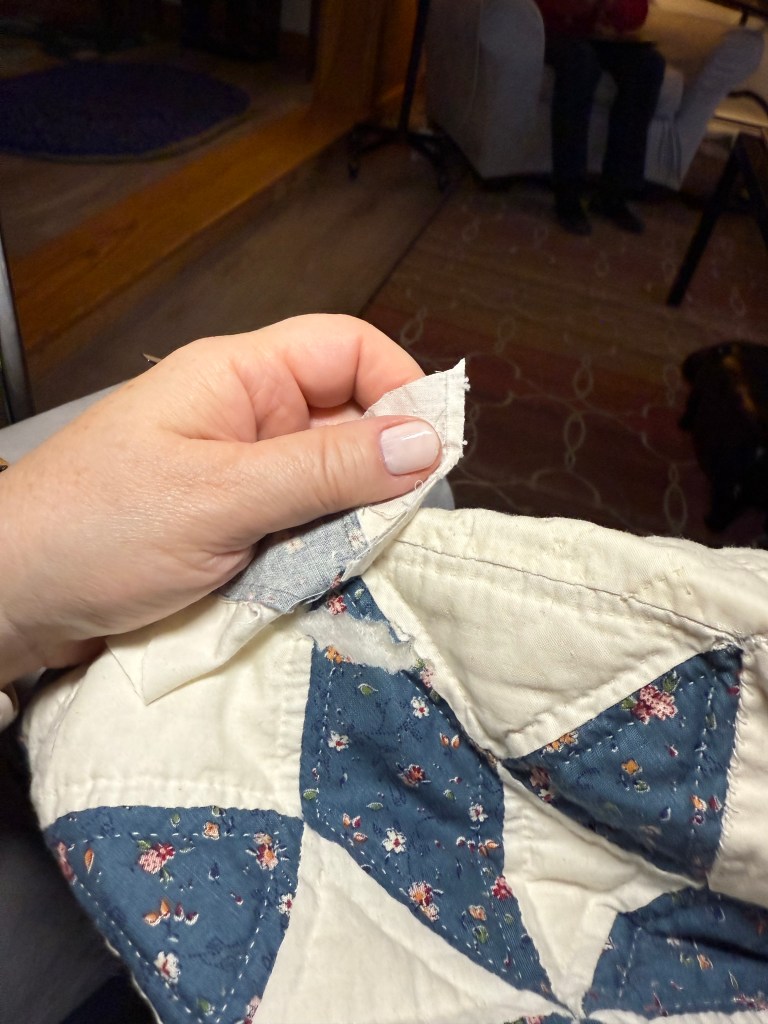 This quilt is an eight-pointed star, possibly the Sarah’s Choice quilt block, in blue calico and cream muslin, and measures 84″ x 97″. The restoration areas – needed on the back and front of the quilt – basically include several of these types of issues (see images at bottom): burn marks, holes, missing batting, mysterious exposed seams, bad patching, and missing quilting.