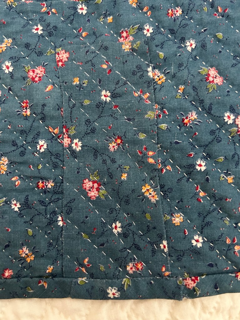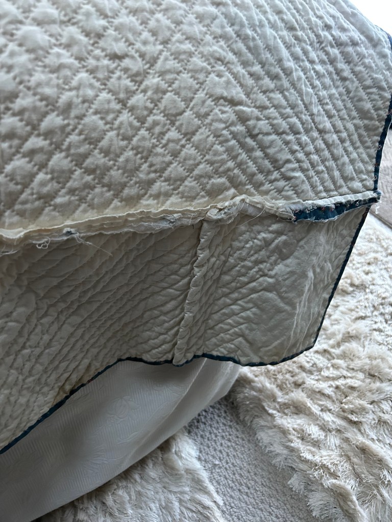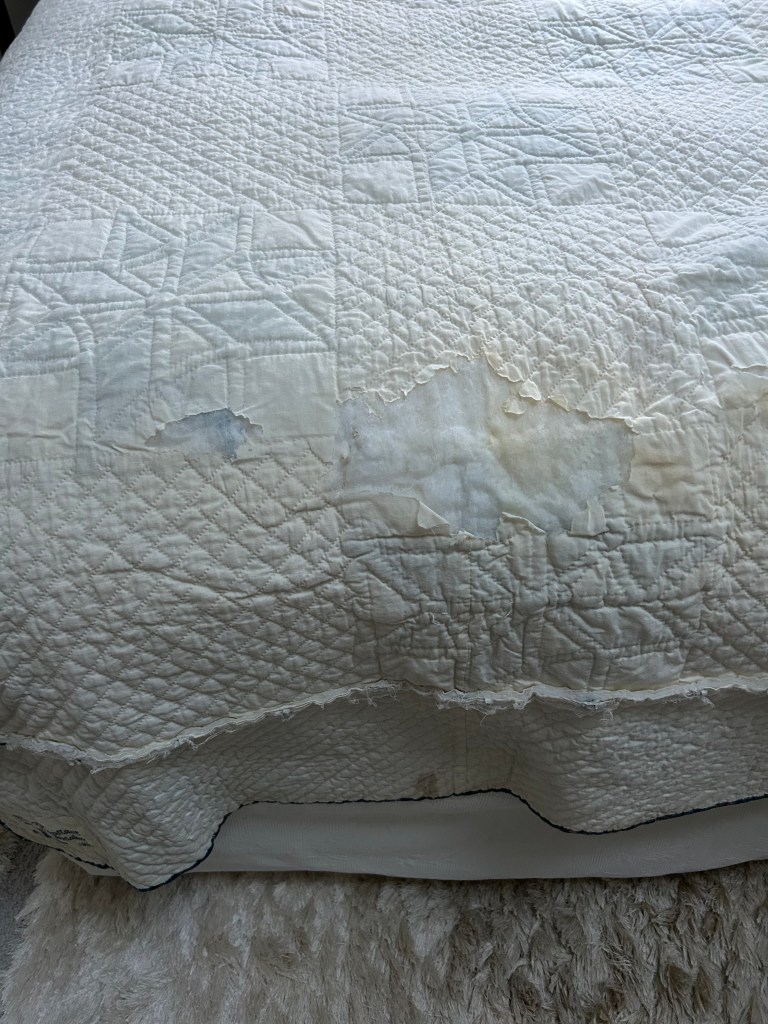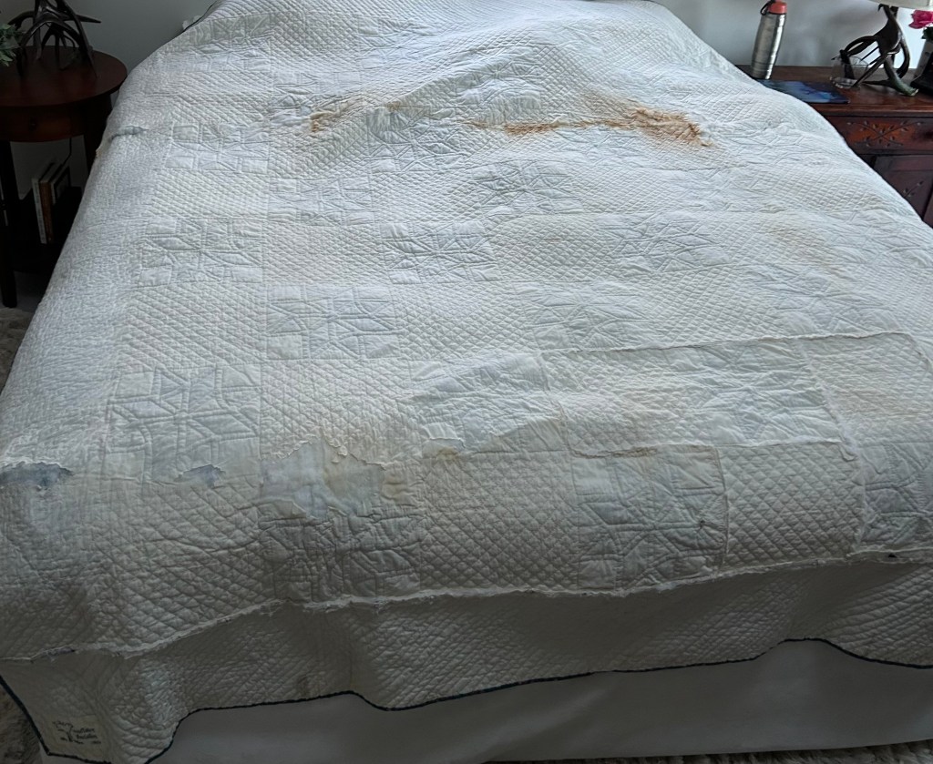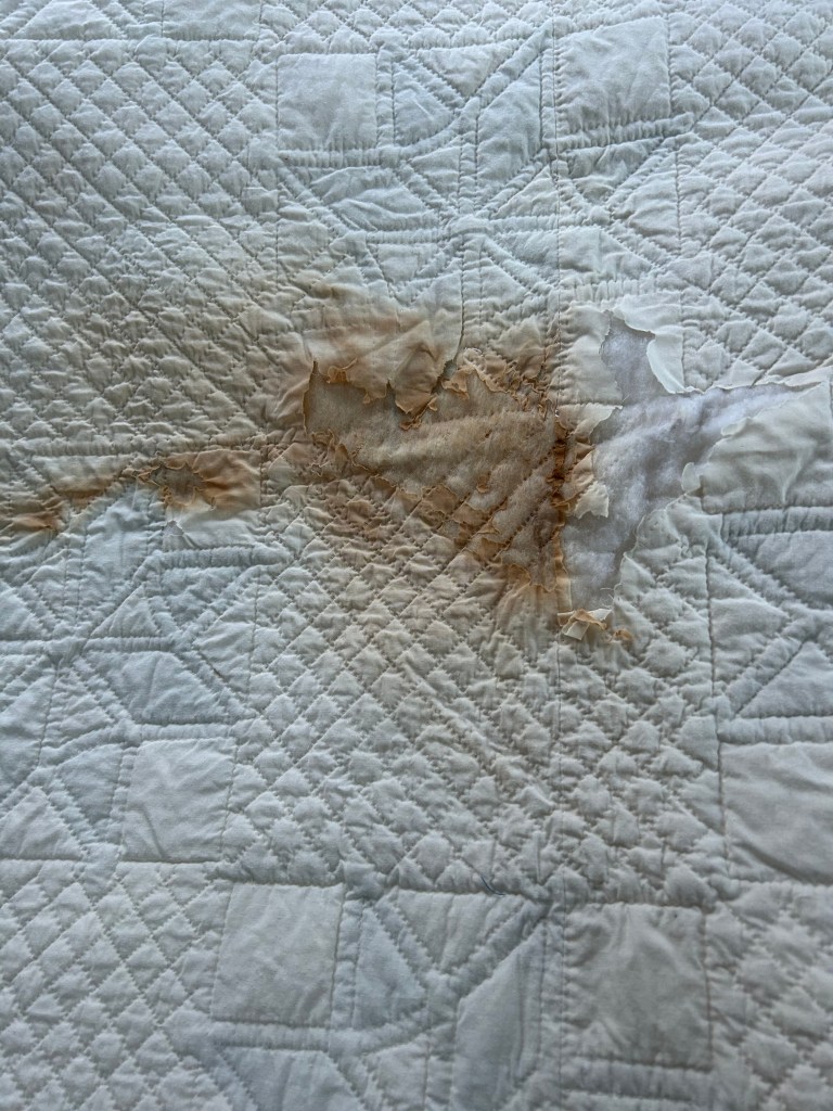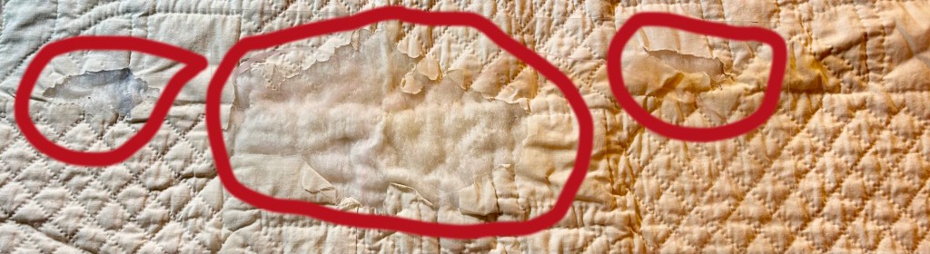 Guiding Principals: do no harm, prioritize the front appearance, do not remove any fabric – only cover up bad areas, repair first then try stain removal (aggressive), leave current repairs as long as they are properly done. Using original fabric, white muslin, and 100% cotton thread. Will add my quilt care label and a hanging sleeve to the back.