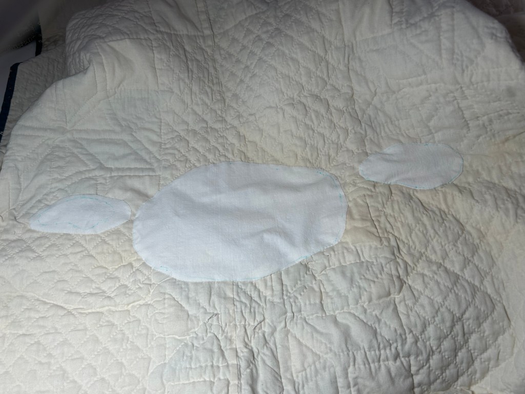 There is a large area on the back where the quilt had holes and missing batting (in red), and missing quilting on the front. Small holes where batting showed through were repaired with rusted appliqué and re-quilted. Some, as shown above, needed larger hand appliquéd pieces and re-quilting.