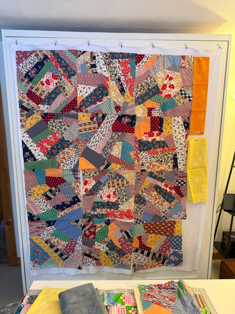 This is a raffle quilt for the Bondville Fair Quilt Show 2026. It is made with the last of the antique quilt blocks donated by Carolyn Harris, made by her mother and aunts between the 1940 – 60s.