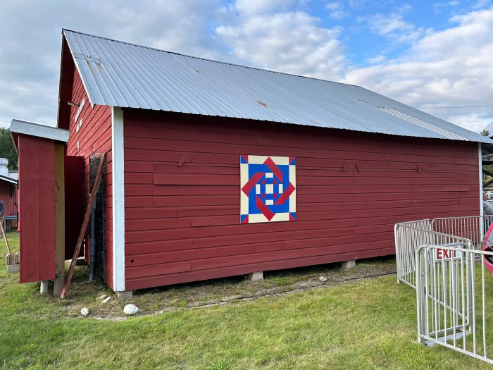 This is the second barn quilt for the Fair. This 48" x 48" plywood has been painted in a dimensional star with a churn dash inside - that was Penny's idea to put it in the center for Churn Dash and red patches too. Penny Allen (Madame Sewloft) helped me in all aspects of this … Continue reading Churn Diamond – A Barn Quilt