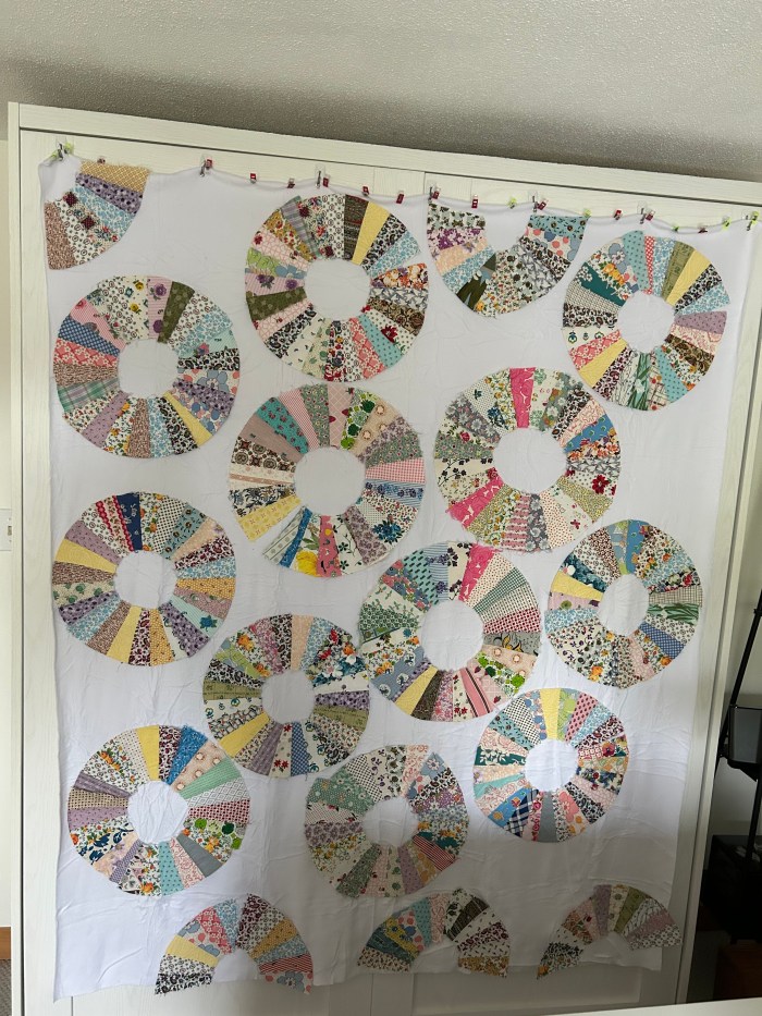 This is a raffle quilt that will be available at this year's Bondville Fair! It uses up the last of the donated blocks from the Harris Family we've been fortunate enough to enjoy for the past 3 years. We have enjoyed making quilts from that box of blocks from the 1920s through the 1940s - … Continue reading Antique Fan Circles, 66″ x 70″, Bondville, VT, 2025.