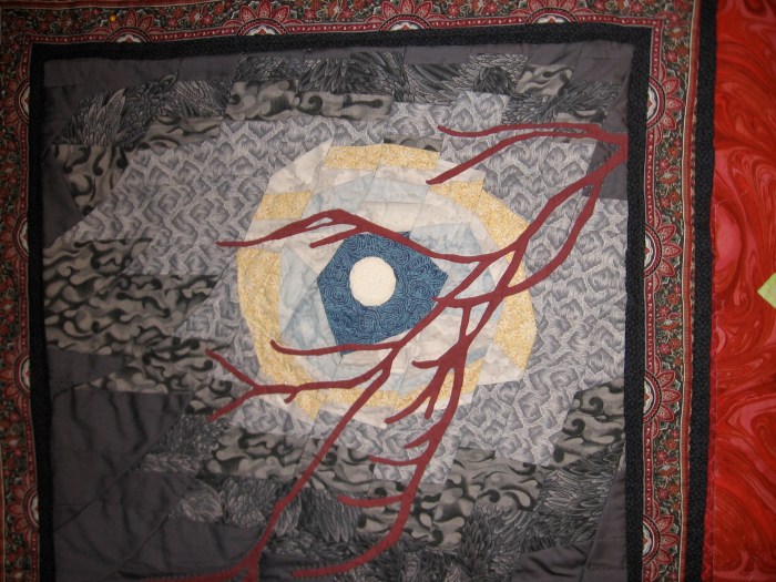 Original design wall hanging of a stunningly beautiful moon I saw one extremely cold January night at my local Dog Park, seen through the branches of a willow tree. Hand pieced, appliqued and quilted. Joan Blalock's landscape string piecing method. (Private Collection) This image has become my quilt-making motif, used on all my quilt labels … Continue reading Cold January Night, 22″ X 28″, Philadelphia, © 2001