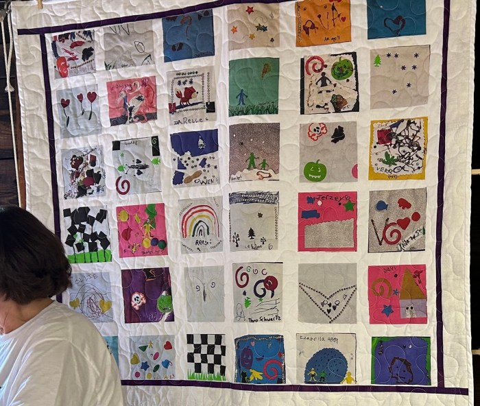 This quilt was created from original photo-collage design, containing images of blocks on paper that the kids made at Bondville Fair 2023. Kindly and lovingly machine quilted and bound by Penny Allen (Madame Sewloft). It was a spoonflower-printer image and was a raffle quilt at this year's Fair. It was won by a couple who's … Continue reading Kids Korner Kwilt, 44″ x 44″, Bondville, VT 2024
