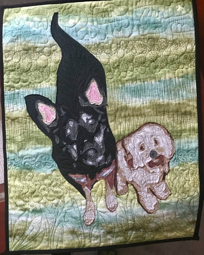 April 2019: this quilt appeared in the Bryn Mawr Presbyterian Church Quilt Show and was originally marked as Not For Sale, but it now is. This wall hanging quilt has been a long time in the making.  It was started in fall of 2013 when my guild held a retreat to learn about Kate Themel's appliqué … Continue reading Steve and Amber, 18″ x 23″, Philadelphia, 2018