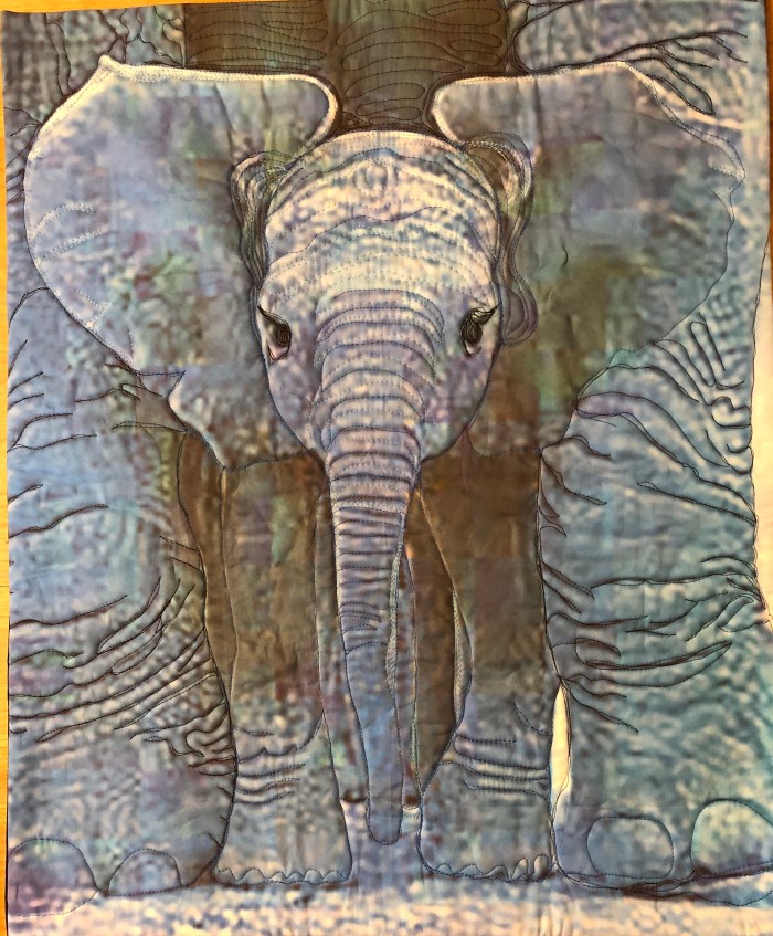 A whole-cloth quilt using a highly manipulated PhotoShop image of a baby elephant, printed on first quality cotton by Spoonflower.com, and machine quilted. this quilt is for my new nephew Maverick, welcome to our family! Images of the back, and the label.