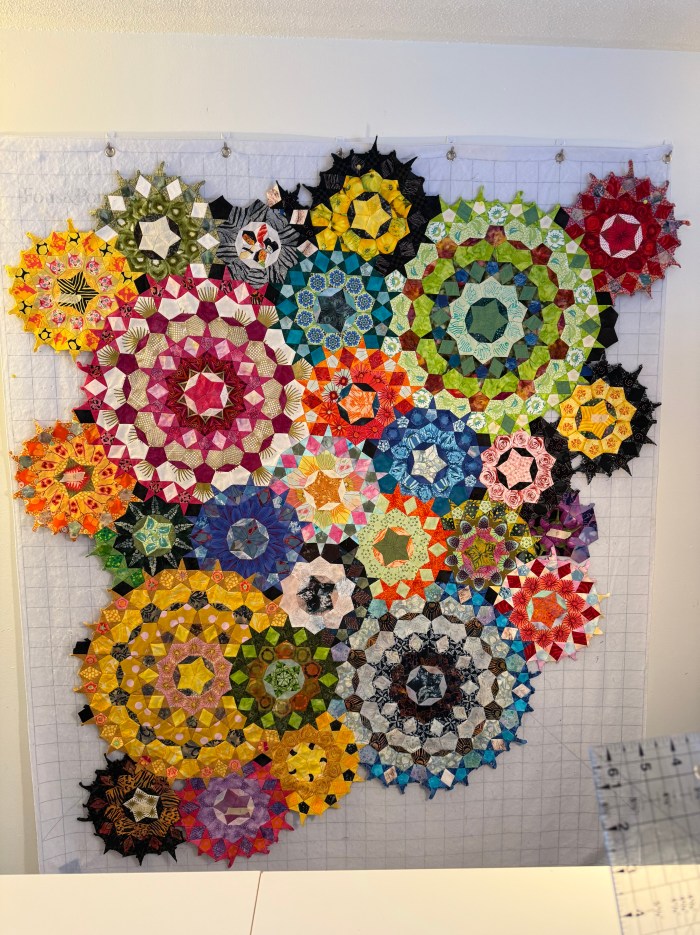 September 2025 update: Completed and I'm so happy with it! It's two-sided, so that will be very useful. I had decided on the black background, and made it reversible with a light blue Grunge on the the other side. The Dresdens were done during a Jean Impey workshop. This quilt is to replace the one … Continue reading Dresden Buffet, 22″ x 90″, Bondville VT 2025